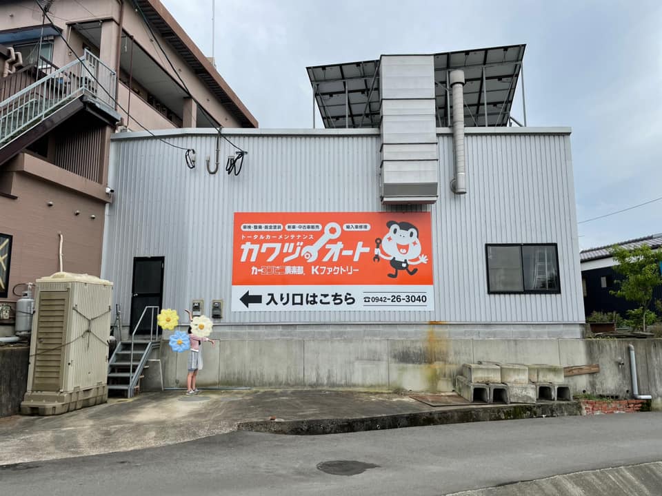 場所がわかりにくいのが悩みだったカワヅオート、小規模事業者持続化補助金で2.4×4.8メートルの看板を設置していただきました♡